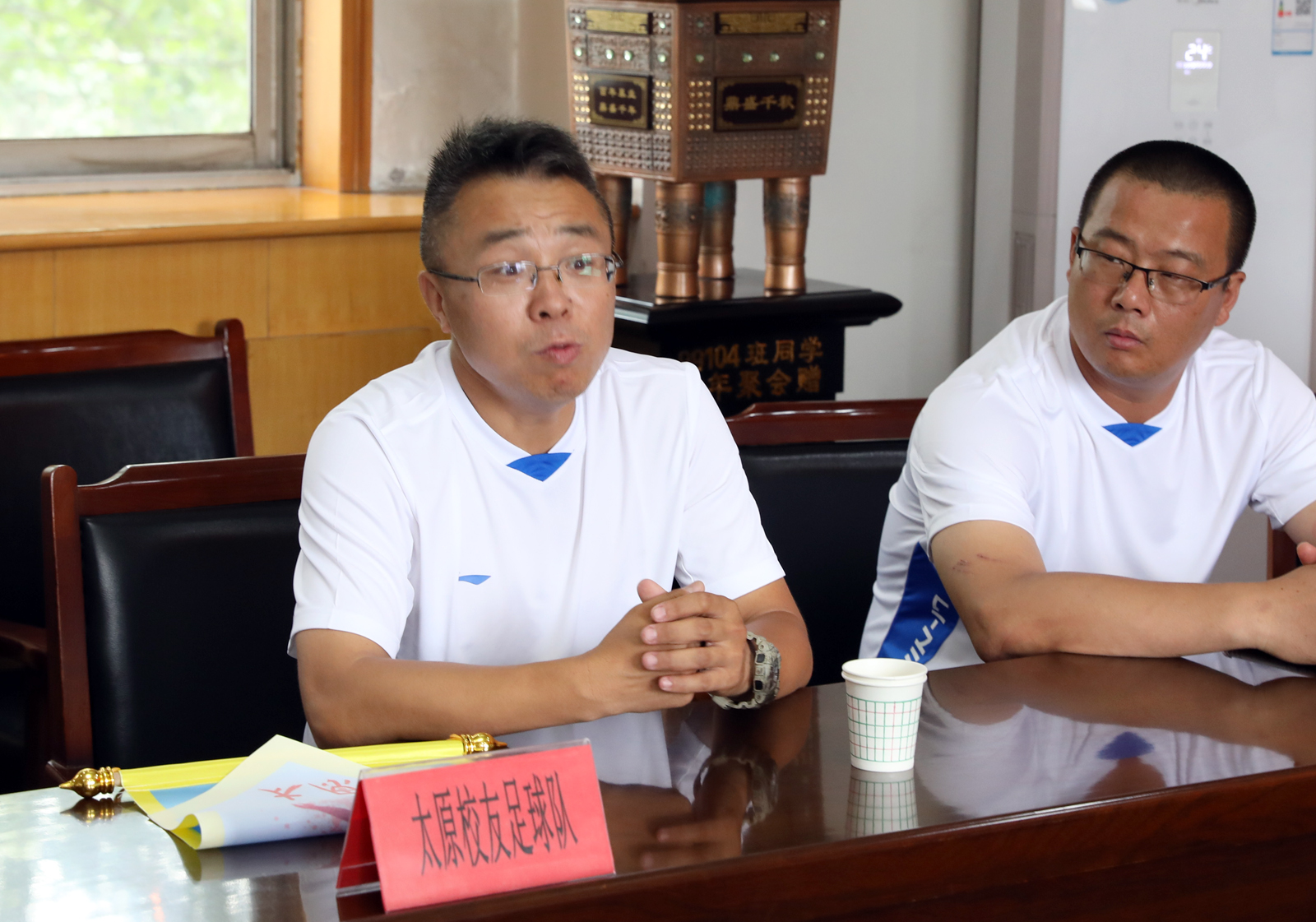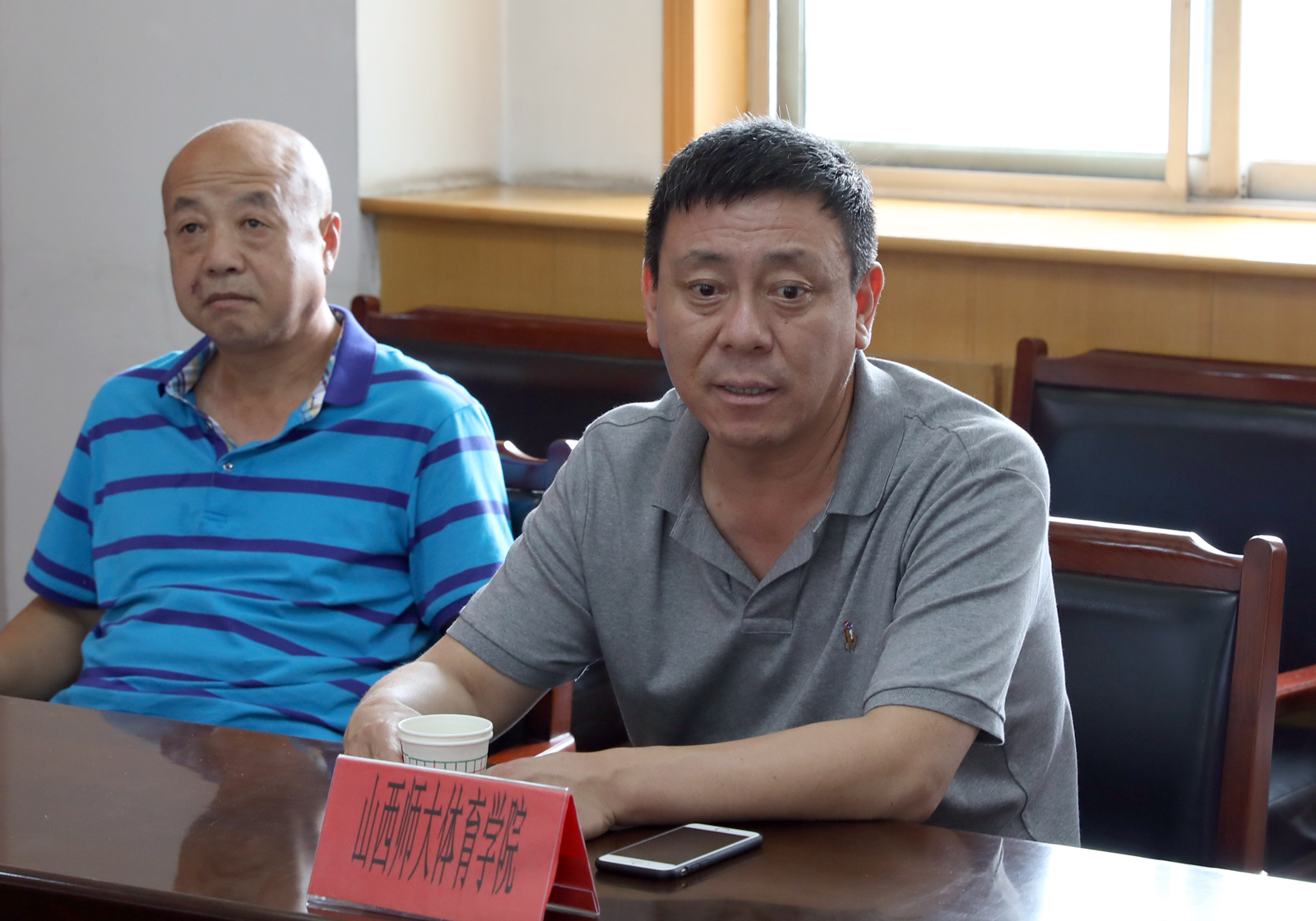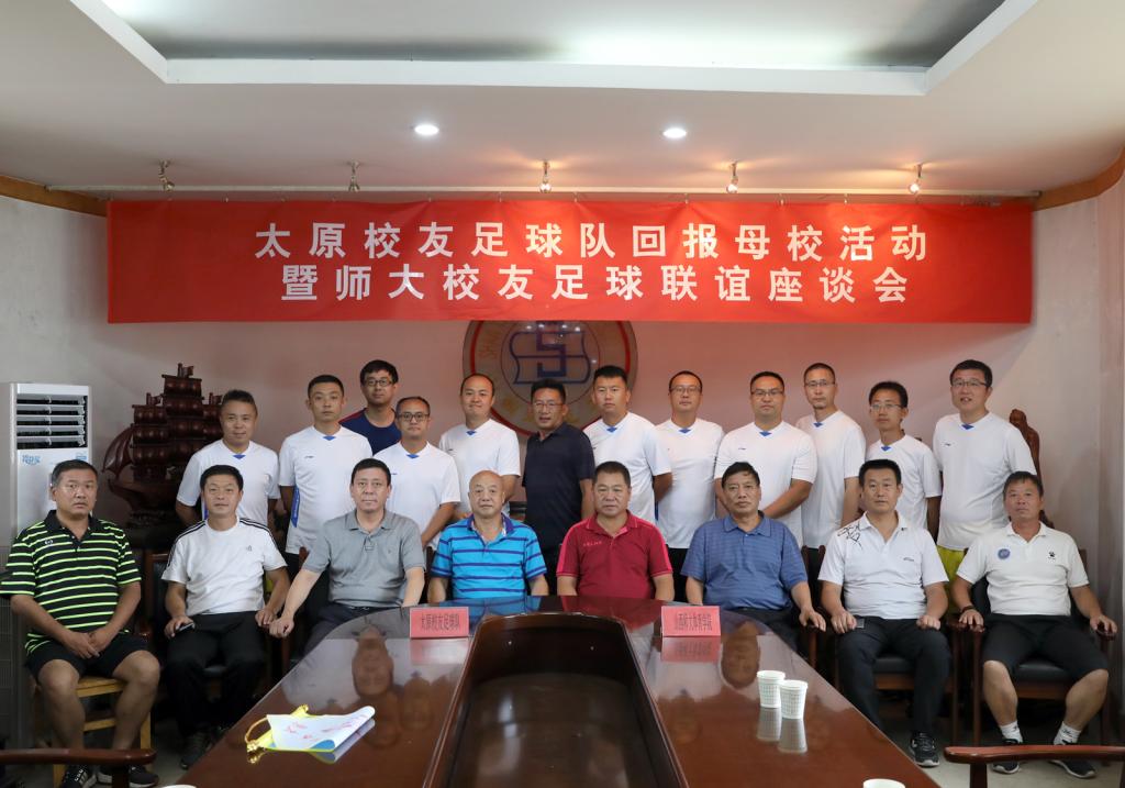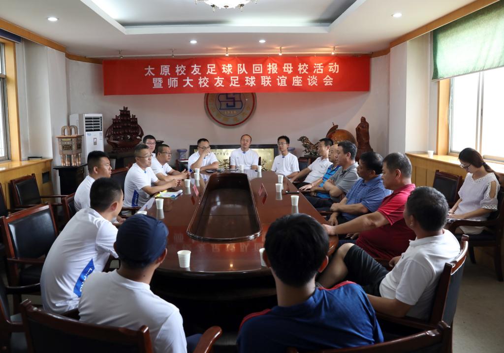 7月8日下午,太原校友足球代表队一行10余人返回母校,并参加了太原校友足球队回报母校活动暨师大校友足球联谊座谈会。院党委书记李学刚、院长郑旗、副院长卢向阳、足球教师李吉慧教授、陆建森副教授、沈国征副教授、梁国强教师、王卫东教师参加座谈会。座谈会由院长郑旗主持。