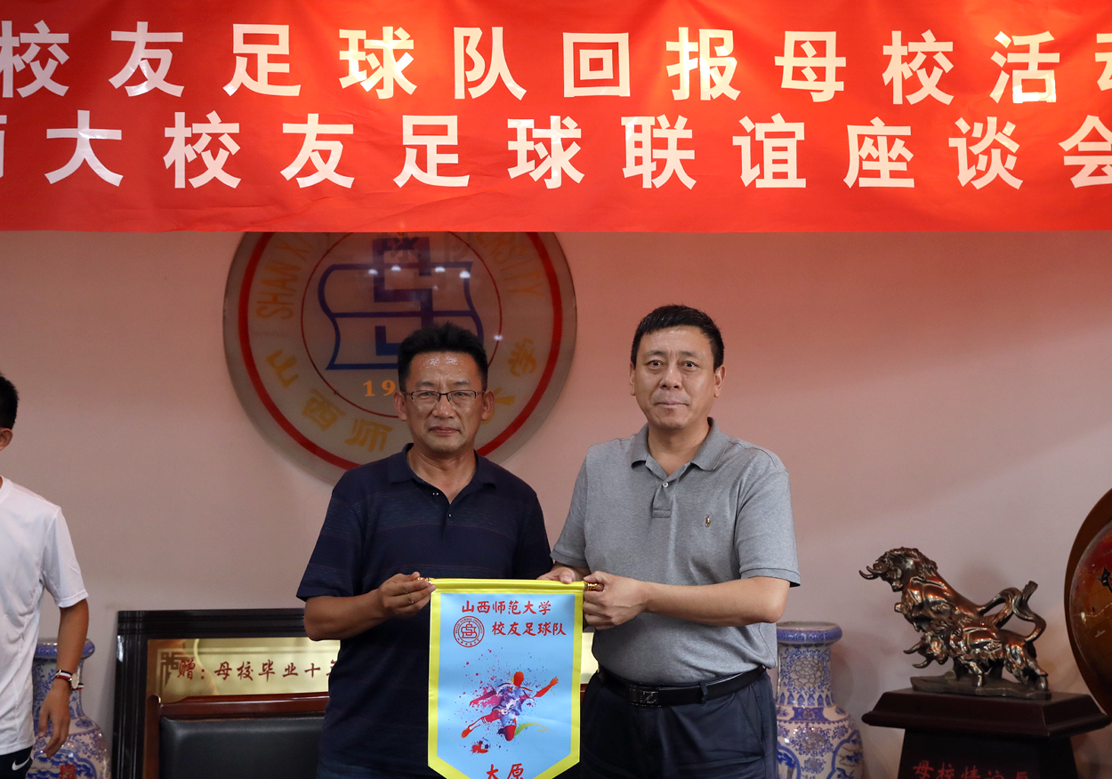 座谈会期间,明升MS88获赠太原校友足球队队旗和全体队员签名的足球。(郑文静 高贯发/文 邓碾管/摄)