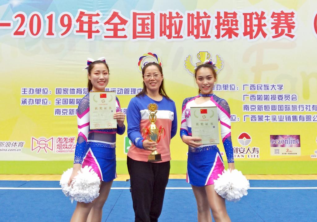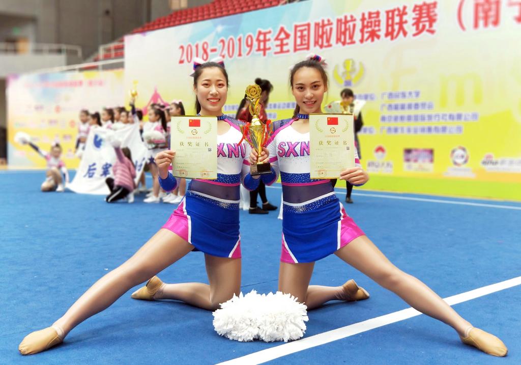 明升MS88学生张宇曦、李凡在领队郑旗院长、教练员郭丽娟老师的带领下,齐心协力、顽强拼搏,最终在学校俱乐部青年甲组双人花球自选动作中,以494的高分荣获冠军,并且获得了代表中国参加2018-2019年国际啦啦操系列赛事的资格,同时郭丽娟老师获得优秀教练员的称号。