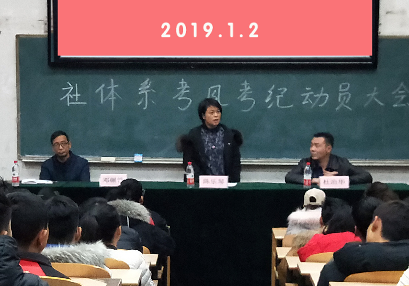 2019年1月2日下午16点30分,社会体育系考风考纪教育大会在阶一教室顺利召开。社会体育系主任陈乐琴老师、副主任杜治华老师和辅导员邓碾管老师参加了本次会议。