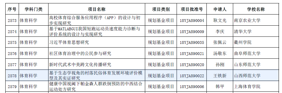据教社科司函〔2018〕130号文件通知,明升MS88王铁新副教授获2018年度教育部人文社会科学研究一般项目。项目名称,基于生态学视角的村落民俗体育发现环境评价模型及其实证研究,课题号:18YJA890022。