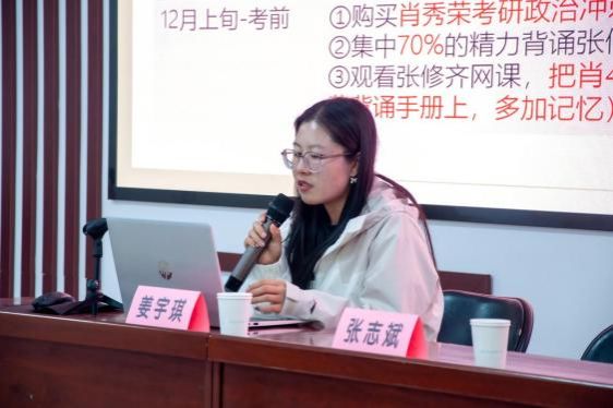 姜宇琪同学以“研究生初试备考策略”为主题,从全局规划与英语备考两方面展开分享。她强调了考研信息获取的重要性,提醒同学们务必通过“研招网”这一权威平台获取信息。在英语备考方面,她提出“词汇突击+语法长难句+阅读+作文”四步法。她特别指出,阅读理解是英语得分的关键,建议同学们反复刷真题、总结方法,作文则应尽早准备、避免模板化。她鼓励大家:“我们或许不擅长英语,但我们有更强的执行力与抗压能力,考研是用长处弥补短板的过程。”
