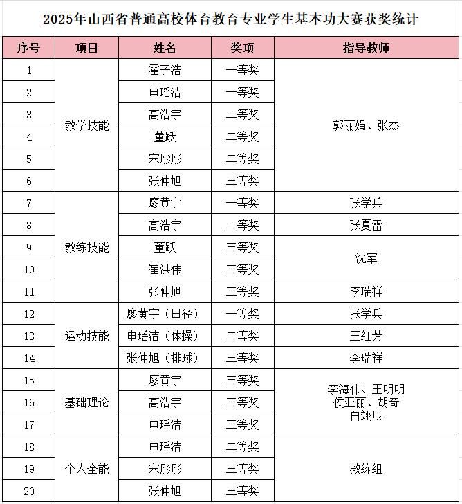 11月13日至16日,2025年山西省普通高等学校体育教育专业学生基本功大赛在山西大学成功举办,吸引了全省10所开设体育教育专业的高校同台竞技,我校学子凭借扎实的专业功底和顽强的拼搏精神,在激烈角逐中脱颖而出,斩获一等奖4项、二等奖6项、三等奖10项。